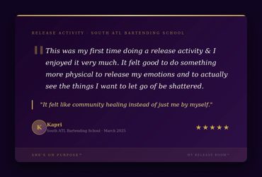 Participating in this release activity was such a powerful and emotional experience. Writing down the things I wanted to let go of and then physically shattering the plate felt incredibly symbolic and freeing. It created a safe space to reflect, process, and release things that I had been holding onto for a long time. The experience was well-guided and meaningful, and I left feeling lighter and more at peace. I’m grateful for the opportunity to take part in something so intentional and healing. I would definitely recommend this to anyone looking for a unique and impactful way to release what no longer serves them.