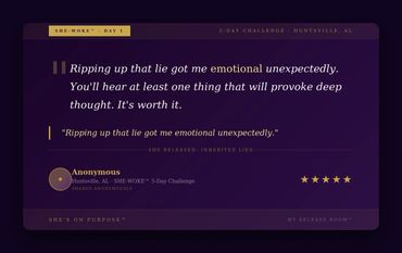 SHE-WOKE™ is a Live Virtual 5-day body-based release journey for the woman who has prayed, journaled, and pushed, and still can't shake what she's carrying.